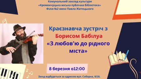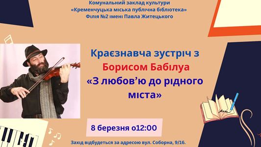8 березня о 12-00 у читальній залі філії № 2 імені Павла Житецького КЗК КМПБ відбудеться краєзнавча зустріч з Борисом Бабілуа «З любов’ю до рідного міста». Це талановита та дуже знана в Кременчуці і за його межами, багатогранна людина : артист театра і кіно, джазмен, учасник багатьох конкурсів джазової музики, літератор, краєзнавець, дослідник історії та культурної спадщини свого регіону. Він відомий дослідженнями місцевої історії, збиранням архівних матеріалів, публікаціями у пресі та участю в культурно-просвітницьких заходах.
