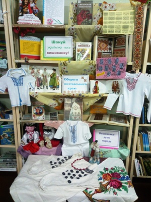 З нагоди цього свята у відділі обслуговування дітей Кременчуцької міської публічної бібліотеки було оформлено виставку-настрій «Шануй українське - носи вишиванку!». На ній розміщені книги, які нададуть вам певні знання про народне мистецтво – вишивання; в них ви знайдете інформацію про закони композиції; ознайомитесь з регіональними особливостями оздоблення виробів в українських національних традиціях та із давніми символами та оберегами слов’янських народів, зокрема українського, – вишиванкою. Виставку прикрасили дитячими вишиваночками, квітами, глиняним посудом, ляльками в національному українському вбранні, є тут і вишиті речі з власної колекції сімейних цінностей бібліотекаря. Виставка має на меті виховувати почуття гордості за свій народ, захоплення мистецтвом українського народу.