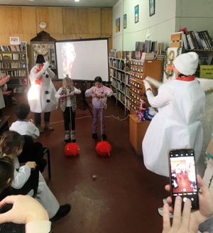 Після музичного привітання до дітлахів вийшли зимові персонажі – Веселі Сніговики, які запросили малечу пограти в ігри: «Відгадай – що це?», «Кумедні Кудлатики», «На кониках – за мішком Санти». Діти, охоплені азартом та командним духом, залюбки грали та змагались. Всім учасникам був гарантований маленький приз – цукерка. Бо які ж новорічні свята без смаколиків? Потім для малечі показали частину вистави за казкою Г.Х.Андерсена «Снігова королева», а діти повинні були відгадати – яка казка була показана? Наприкінці заходу бібліотекар запросила ще одного персонажа – саму Білосніжну Зиму, яка також пригостила дітлахів смаколиками. Дітлахи залишали бібліотеку у святково-піднесеному настрої та посмішками, бо свято наближається!