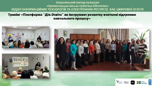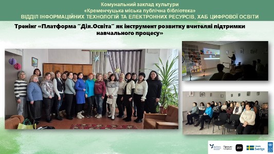 5, 6 і 8 січня у Відділі інформаційних технологій та електронних ресурсів (Хабі цифрової освіти) Кременчуцької міської публічної бібліотеки відбувся тренінг для професійної спільноти вчителів української мови та літератури, вчителів естетичного циклу ЗЗСО та заступників директора освітніх закладів м.Кременчука на тему: «Платформа Дія.Освіта як інструмент розвитку вчителя і підтримки навчального процесу». Захід був присвячений ознайомленню освітян із можливостями національної платформи «Дія.Освіта» та практичному використанню її ресурсів як у професійній діяльності, так і для особистої самоосвіти.