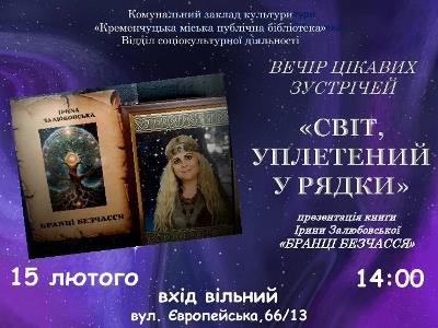 15 лютого 2026 року о 14:00 у літературній вітальні Кременчуцької міської публічної бібліотеки відбудеться вечір цікавих зустрічей з письменницею та ілюстраторкою Іриною Залюбовською.