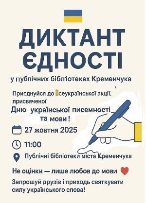 У дружній атмосфері бібліотеки ми разом напишемо диктант, обговоримо цікаві мовні факти та отримаємо задоволення від спільної справи. Не хвилюйтеся — це не тест, а свято українського слова, де головне не оцінка, а любов до мови.