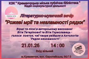 21 січня о 14:00 у літературній вітальні Кременчуцької міської публічної бібліотеки відбудеться літературно-музичний вечір «Рожеві мрії та незламності рядки». Захід підготував