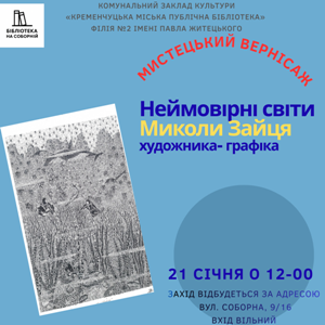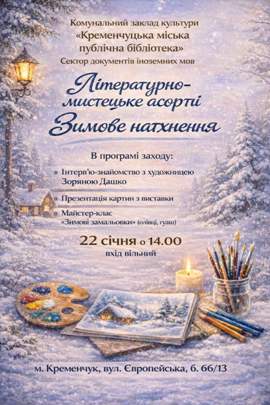 22 січня 2026 року о 14:00 в Кременчуцькій міській публічній бібліотеці відбудеться літературно-мистецьке асорті «Зимове натхнення». За захід відповідає