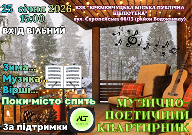 25 січня 2026 року о 15:00 в Кременчуцькій міській публічній бібліотеці (відділ соціокультурної діяльності) відбудеться музично-поетичний квартирник «Зима…Музика…Вірші…Поки місто спить», мета якого - створити теплу атмосферу живої музики й поезії, підтримка живого слова й акустичного звучання у форматі квартирника.