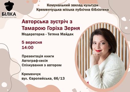 5 вересня о 14:00 Кременчуцька міська публічна бібліотека запрошує усіх бажаючих на зустріч з Тамарою Горіха Зерня в рамках проекту «Літературні зустрічі на Європейській».
