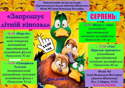 Щосереди, об 11:00, запрошуємо дітей віком 6+ та їхніх батьків до нашої бібліотеки, щоб провести канікули цікаво, весело та з максимальною користю, адже літні канікули – це час для відпочинку, відновлення сил та накопичення енергії! Бібліотекарі підготували програму демонстрації сучасних зарубіжних комп’ютерно-анімаційних фільмів.