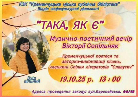 19 жовтня о 13:00 запрошуємо всіх на музично-поетичний вечір "Така, як є" у актовій залі Кременчуцької міської публічної бібліотеки (вул. Європейська, 66/13), де буде царювати слово і музика!
