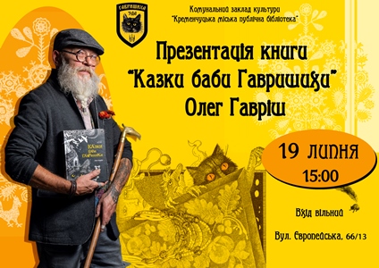 19 липня о 15:00 у Кременчуцькій міській публічній бібліотеці відбудеться творча зустріч з автором Олегом Гаврішем та презентація його книги «Казки баби Гавришихи».