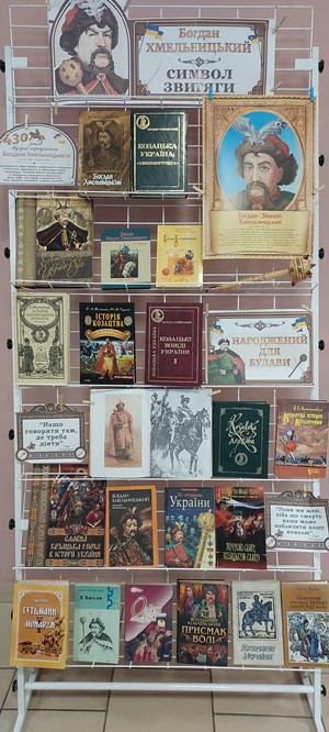 До 430-річчя від дня народження видатного гетьмана у Філії №5 імені Михайла Парнети організовано книжкову виставку – постать «Богдан Хмельницький – володар звитяги».