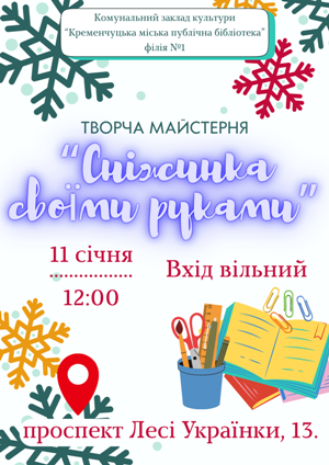11 січня 2026 року о 12:00 бібліотекарі філії №1 гостинно запрошують дітей на теплий, пізнавальний і по-справжньому казковий захід - ТВОРЧА МАЙСТЕРНЯ «Сніжинка своїми руками».