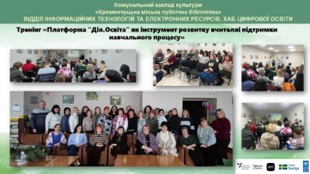 5, 6 і 8 січня у Відділі інформаційних технологій та електронних ресурсів (Хабі цифрової освіти) Кременчуцької міської публічної бібліотеки відбувся тренінг для професійної спільноти вчителів української мови та літератури, вчителів естетичного циклу ЗЗСО та заступників директора освітніх закладів м.Кременчука на тему: «Платформа Дія.Освіта як інструмент розвитку вчителя і підтримки навчального процесу». Захід був присвячений ознайомленню освітян із можливостями національної платформи «Дія.Освіта» та практичному використанню її ресурсів як у професійній діяльності, так і для особистої самоосвіти.