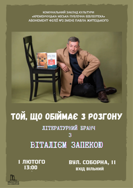 1 лютого о 13:00 філія №2 імені Павла Житецького КЗК КМПБ запрошує усіх бажаючих на літературний бранч з одним із найяскравіших сучасних українських письменників, лауреатом багатьох літературних премій, зокрема Всеукраїнської літературної премії ім. Всеволода Нестайка (за книгу «Полінка»), премій «Воїн світла», ім. Якова Гальчевського, ім. Ірини Вільде, а його роман «Цуцик» потрапив до довгого списку Національної премії ім. Т. Г. Шевченка - Віталієм Запекою.