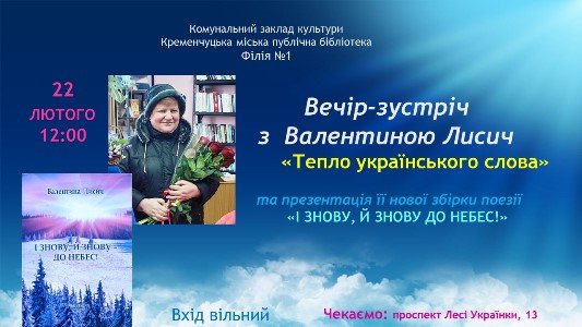 22 лютого 2026 року о 14:00 в літературній вітальні Кременчуцької міської публічної бібліотеки відбудеться вечір-зустріч з циклу «Кременчук у подіях і долях» з письменницею Валентиною Коміною.