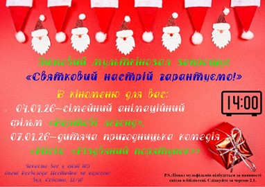 У січні, під час шкільних канікул, у Філії №3 імені Всеволода Нестайка Кременчуцької міської публічної бібліотеки відбудуться святкові перегляди дитячих фільмів. 04 та 07 січня о 14:00 для дітей та їх родин будуть демонструватися сучасні різдвяно-новорічні комп’ютерно-анімаційні фільми.