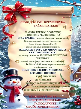 Відділі обслуговування дітей Кременчуцької міської бібліотеки (вул. Європейська, 66/13) кожен маленький мрійник зможе НАПИСАТИ ТАЄМНОГО ЛИСТА СВЯТОМУ МИКОЛАЮ та залишити його у ЧАРІВНІЙ ПОШТОВІЙ СКРИНЬЦІ.